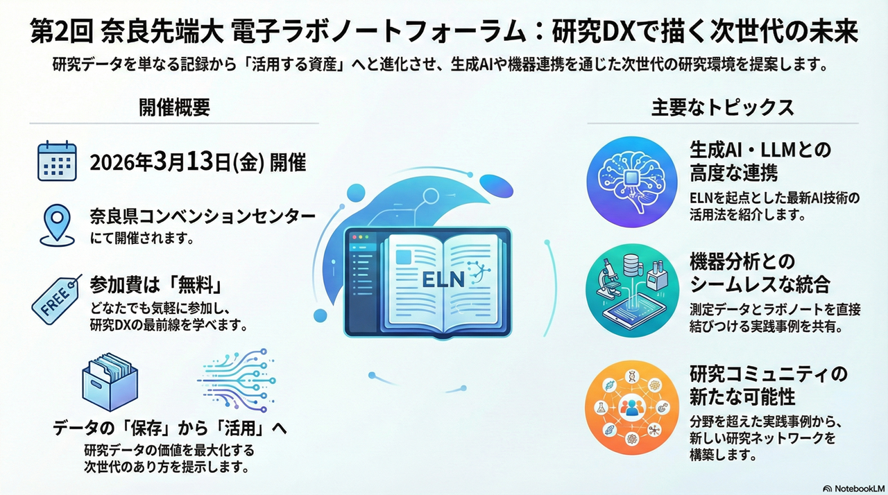今回開催予定の「第2回 NAIST 電子ラボノートフォーラム」では、電子ラボノート(ELN)の研究応用に焦点を当て、生成 AI・LLM とのデータ連携、機器分析との接続、さまざまな研究分野での実践事例、新たなコミュニティ形成の可能性をご紹介します。